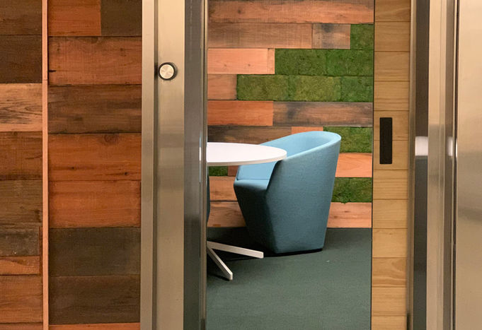 Upcoming project phases include new phone booths for Adjust’s common area basement and full acoustic redesign with similar reclaimed redwood paneling and moss.